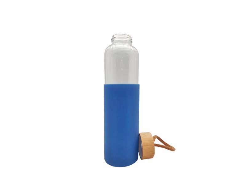 Cristem: Eco-friendly glass bottle with shock-resistant sleeve and bamboo rope lid; BPA & PVC free, in Blue. The sleeve enhances grip and protection, while the rope aids comfortable carrying.