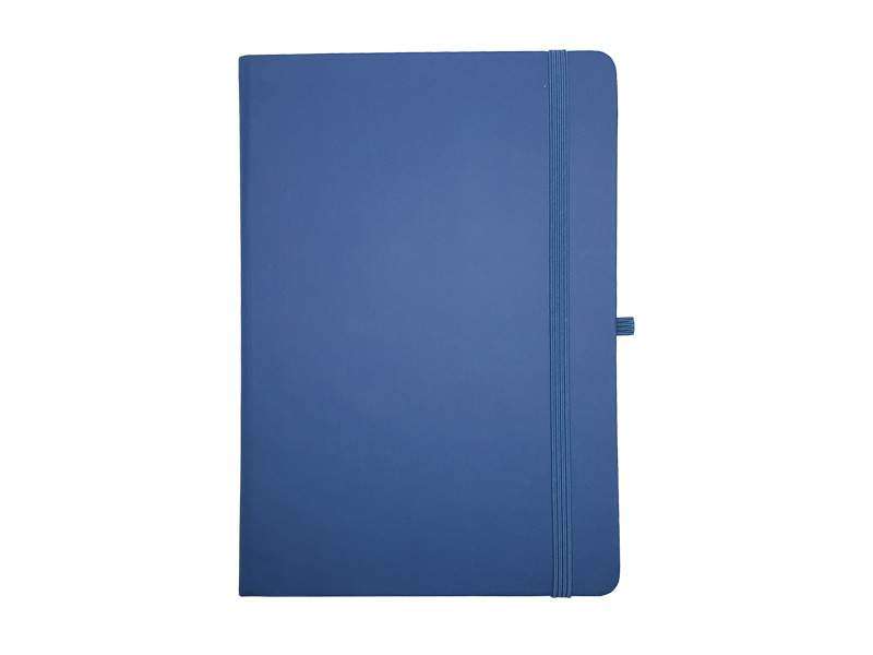 Inexmatt: A5 leatherette notebook with ribbon marker, pen loop, elastic closure, and 80 sheets, in Blue. Soft-touch finish elevates the writing experience and brand perception.