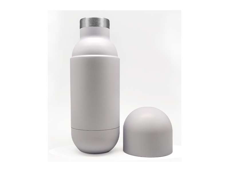 Anshim: Soft-touch double-wall insulated bottle with cup-like lid; 18/8 stainless, spill- and leak-proof, in White. The cup-lid adds elegance to impromptu servings while temperature retention excels for both hot and cold drinks.