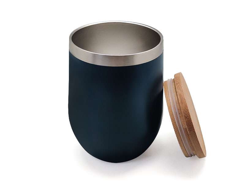 B-URT: 350ml vacuum-insulated stainless mug with eco bamboo lid; dishwasher-safe and shatter-proof, in Blue.