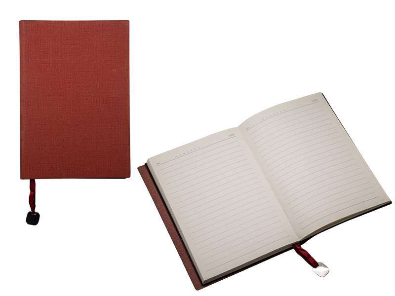 A5 fabric textured leatherette tan colour single lined notebook with a matte finish making it an essential business meeting, presentation, employee giveaway notebook.