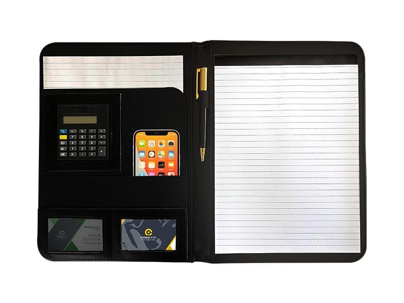 This clean, elegant leatherette A4 portfolio/folder comes with pockets on the inside cover, card slots, a pen holder, a notepad, and an attached calculator. Luxurious organising- the key to smooth functioning. Customise the cover with elegant embossing/debossing or printing of your company name/logo, and they’re ready to use!