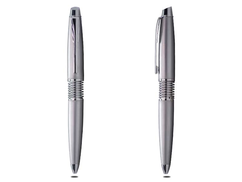 This nifty, sleek, blue body ball point pen with silver trimmings and a classy, silver spring design makes for a swanky, elegant, and trendy corporate gift.