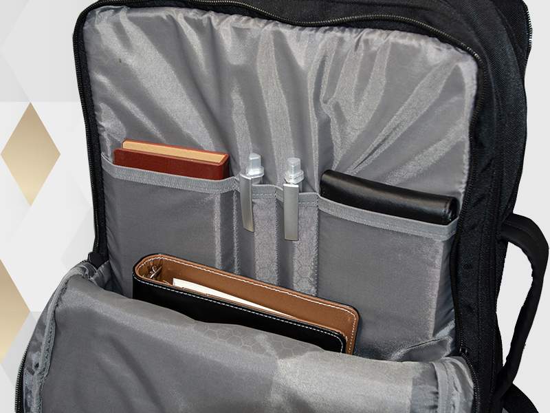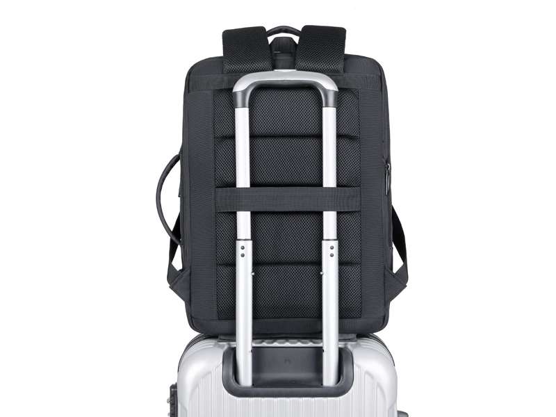 A belt on the back allows the backpack to slide over the handle tube of any luggage trolley.