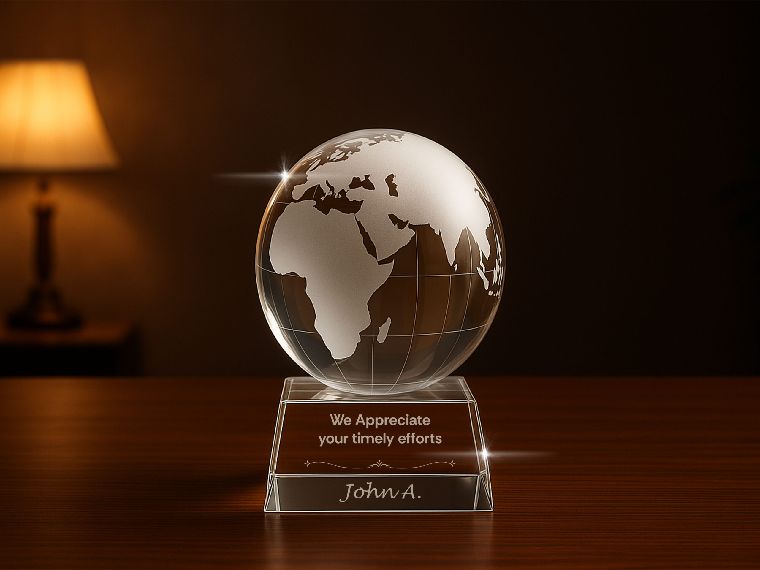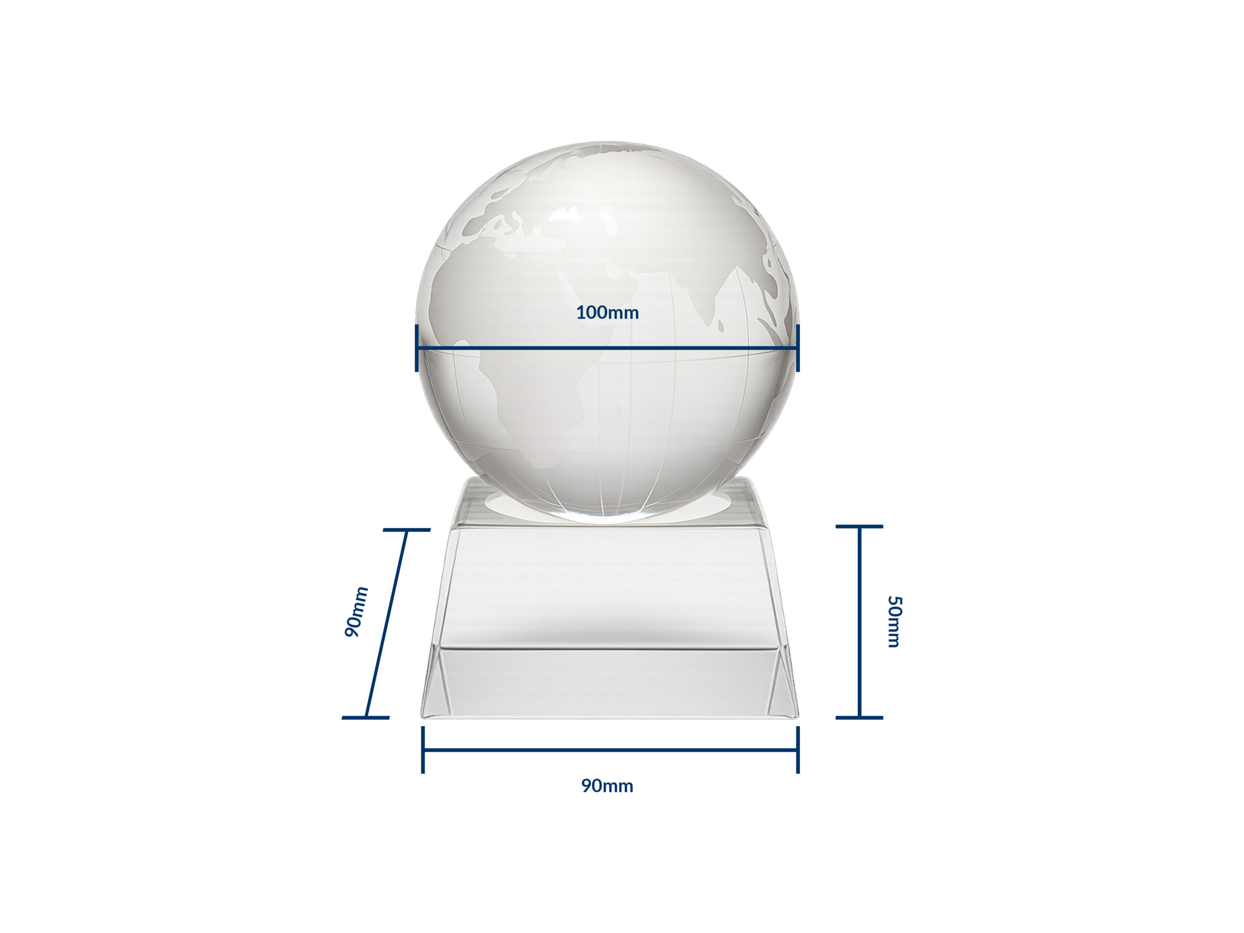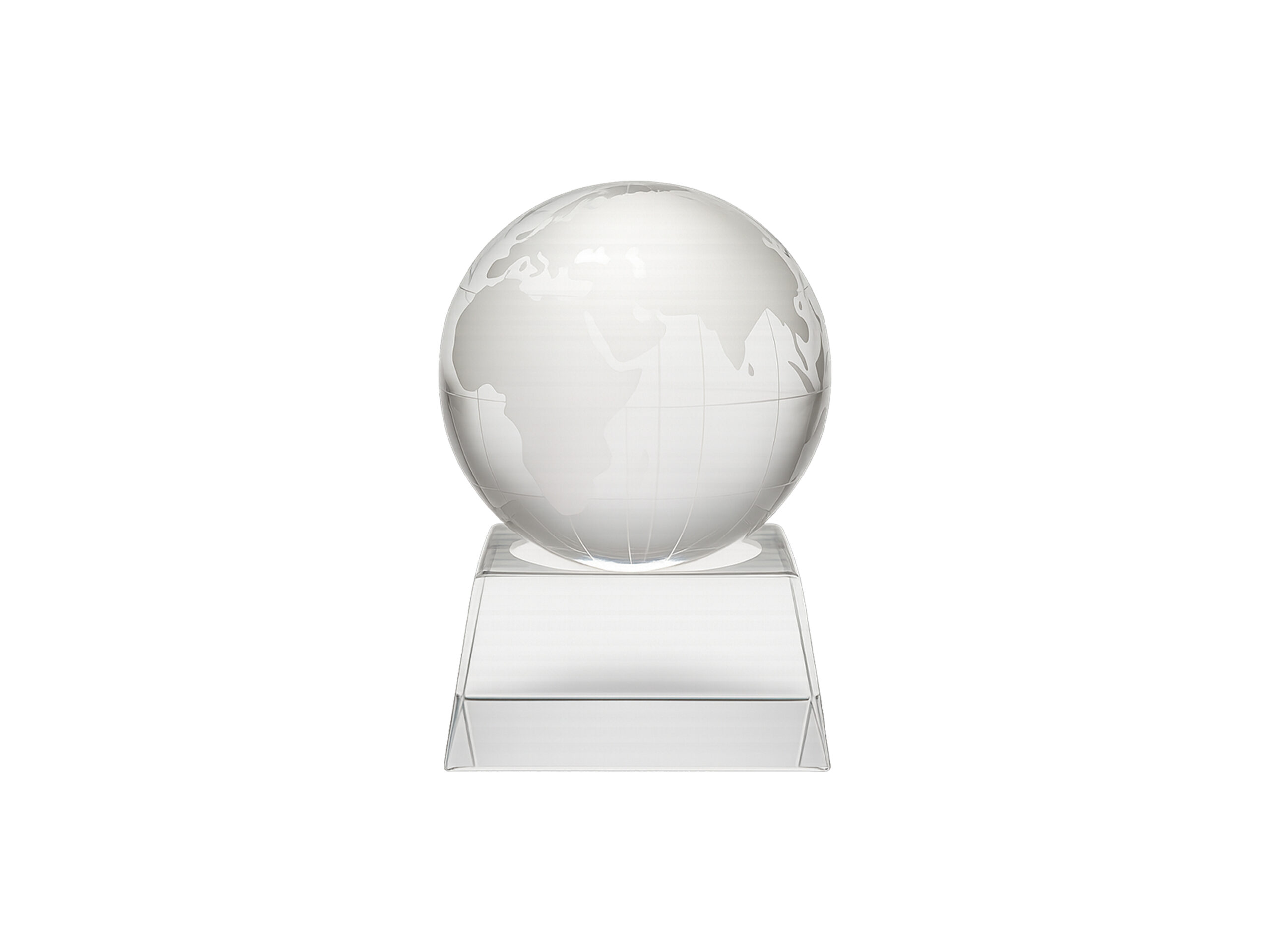 Crafted from high-clarity optical crystal, the globe features a detailed, sand-etched continents design that appears to float in three dimensions. The globe sits firmly on a perfectly matched glass base, creating an award that is both durable and visually striking. The base can be laser-engraved with your company logo, recipient name, and message to personalize it for any occasion.