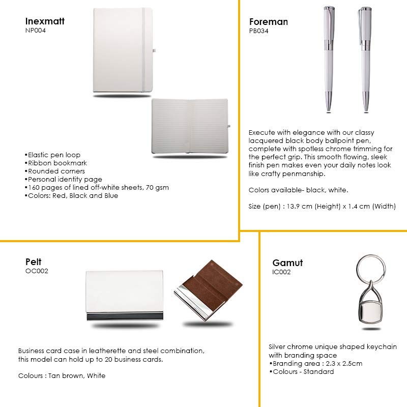 An economical classic gifting option when you can’t just choose one product to gift to your client or employees. This gift set fulfils business meeting needs with its notebook, cardcase, pen & keychain serving as a perfect branding option for company as well.