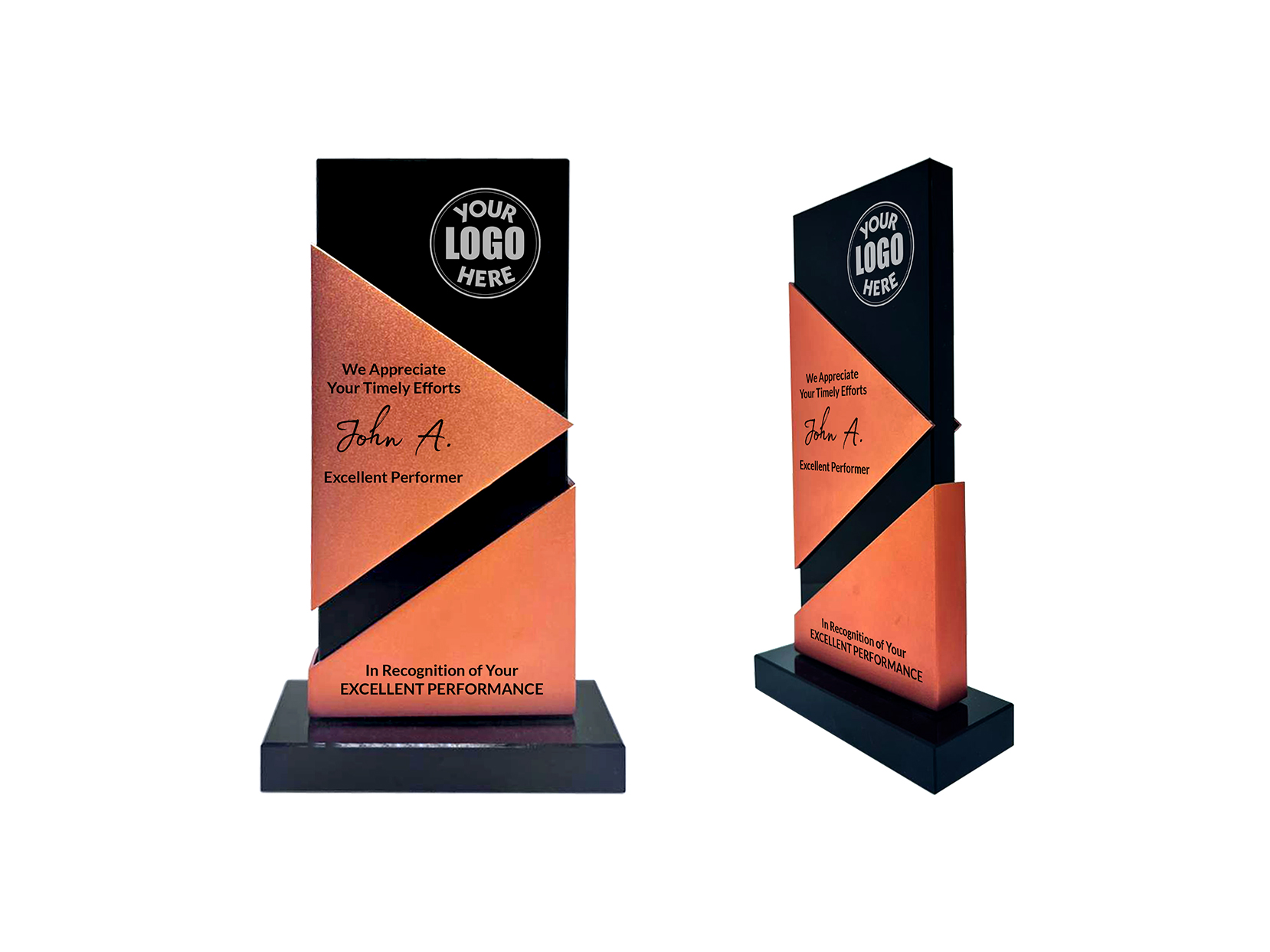 The Rogoba Black Glass Trophy is a sophisticated recognition piece crafted for corporate events, award ceremonies, and professional achievements. Made from premium thick black glass, it presents a sleek rectangular form that embodies elegance and authority. The contrasting rose gold metallic geometric accents give the trophy a contemporary flair, ensuring it stands out as both a symbol of prestige and a decorative statement.