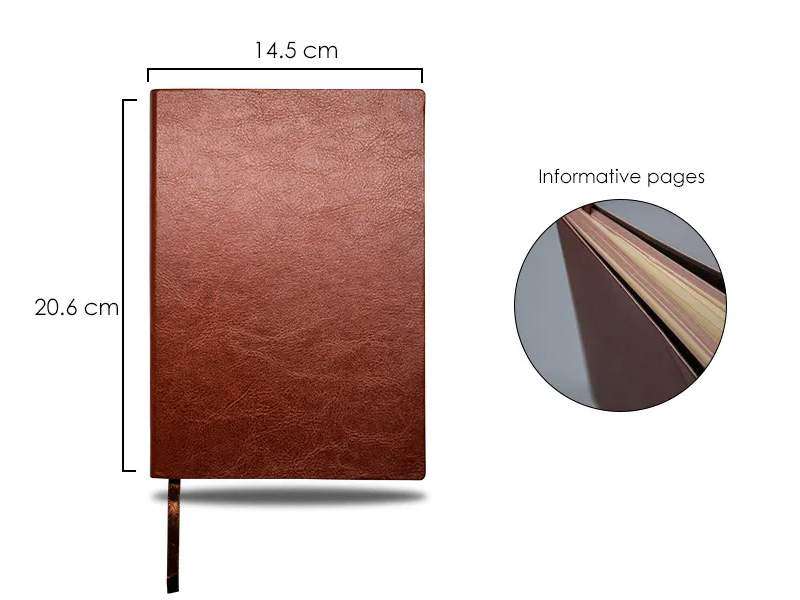 The Supremo A5 Notebook is an excellent choice for corporate gifting on any occasion. Bound with a glossy leatherette soft-textured cover in a classic tan shade, it combines elegance with durability. The brown-coloured sheet borders add a unique touch, making it stand out from ordinary notebooks. Designed with lined pages, it ensures smooth writing while keeping your notes neat and organised. Its compact A5 size makes it easy to carry, whether for business meetings, travel, or daily use. With its refined design and professional appeal, the Supremo A5 Notebook is sure to leave a lasting impression.