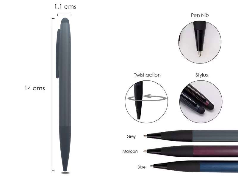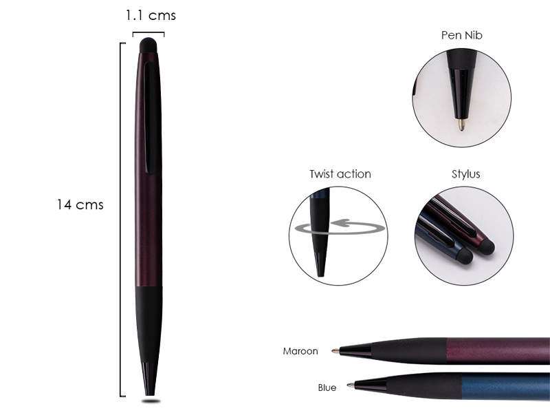 Simple, elegant, and reliable, this twist-action burgundy matte-finish ballpoint pen with stylus is an elegant take-away. Customise them with your company logo, and you have a memorable promotional giveaway.